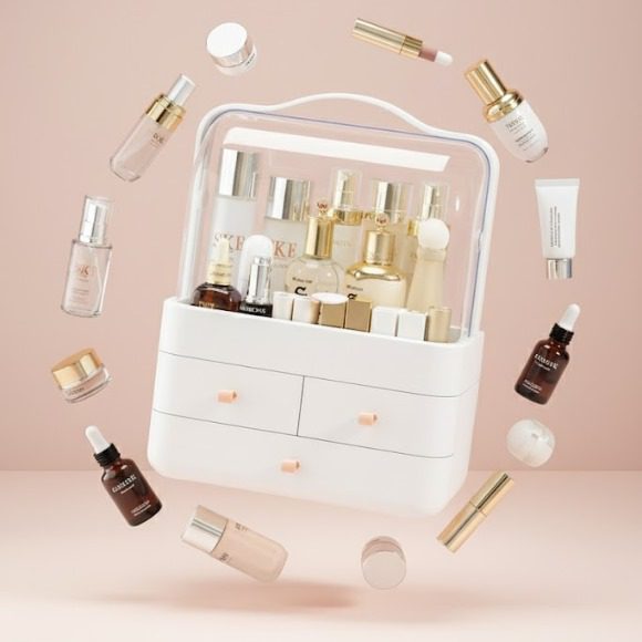Conçue pour organiser vos produits de maquillage, soins, parfums et accessoires, elle associe design moderne et praticité grâce à son couvercle transparent 180° anti-poussière et ses deux tiroirs spacieux.