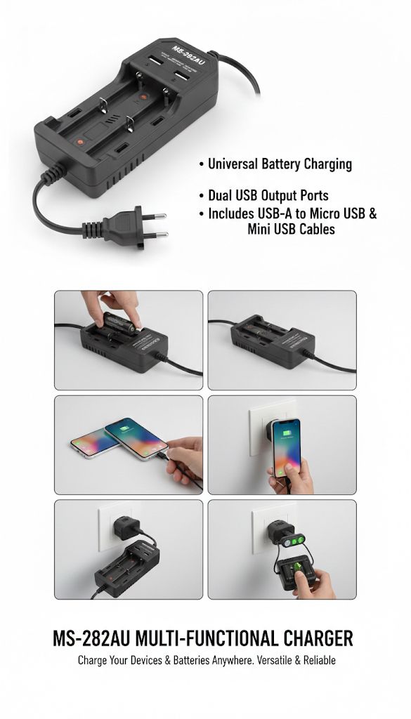 Le chargeur MS-282AU est un chargeur universel polyvalent conçu pour recharger aussi bien les batteries cylindriques que les smartphones et accessoires USB. Compact, fiable et pratique, il s’adapte à de nombreuses situations grâce à ses 2 ports USB, ses câbles inclus et son alimentation secteur. Idéal pour un usage à la maison, au bureau, en atelier ou en déplacement.