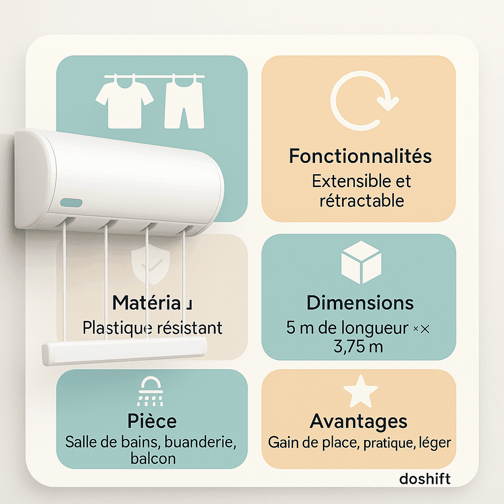 Cette corde à linge escamotable est la solution idéale pour les petites salles de bains, balcons ou buanderies. Compacte et discrète, elle se rétracte facilement lorsqu’elle n’est pas utilisée, offrant un véritable gain de place. Son matériau en plastique blanc lui permet de résister à l’humidité tout en restant léger et durable. Avec une longueur réglable allant jusqu’à 5 mètres, elle est parfaite pour sécher le linge de manière pratique et efficace. Installation simple, utilisation intuitive — un indispensable pour optimiser l’espace de votre maison.