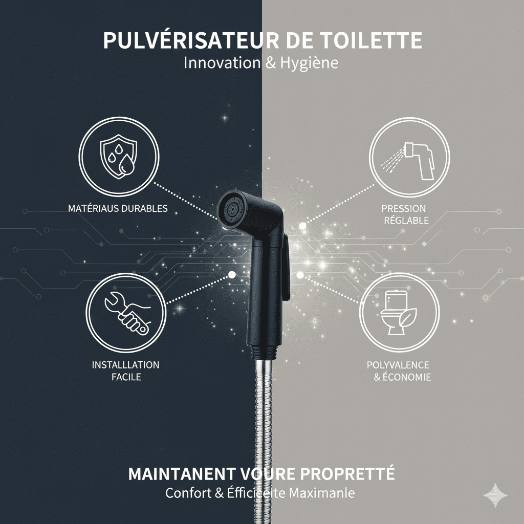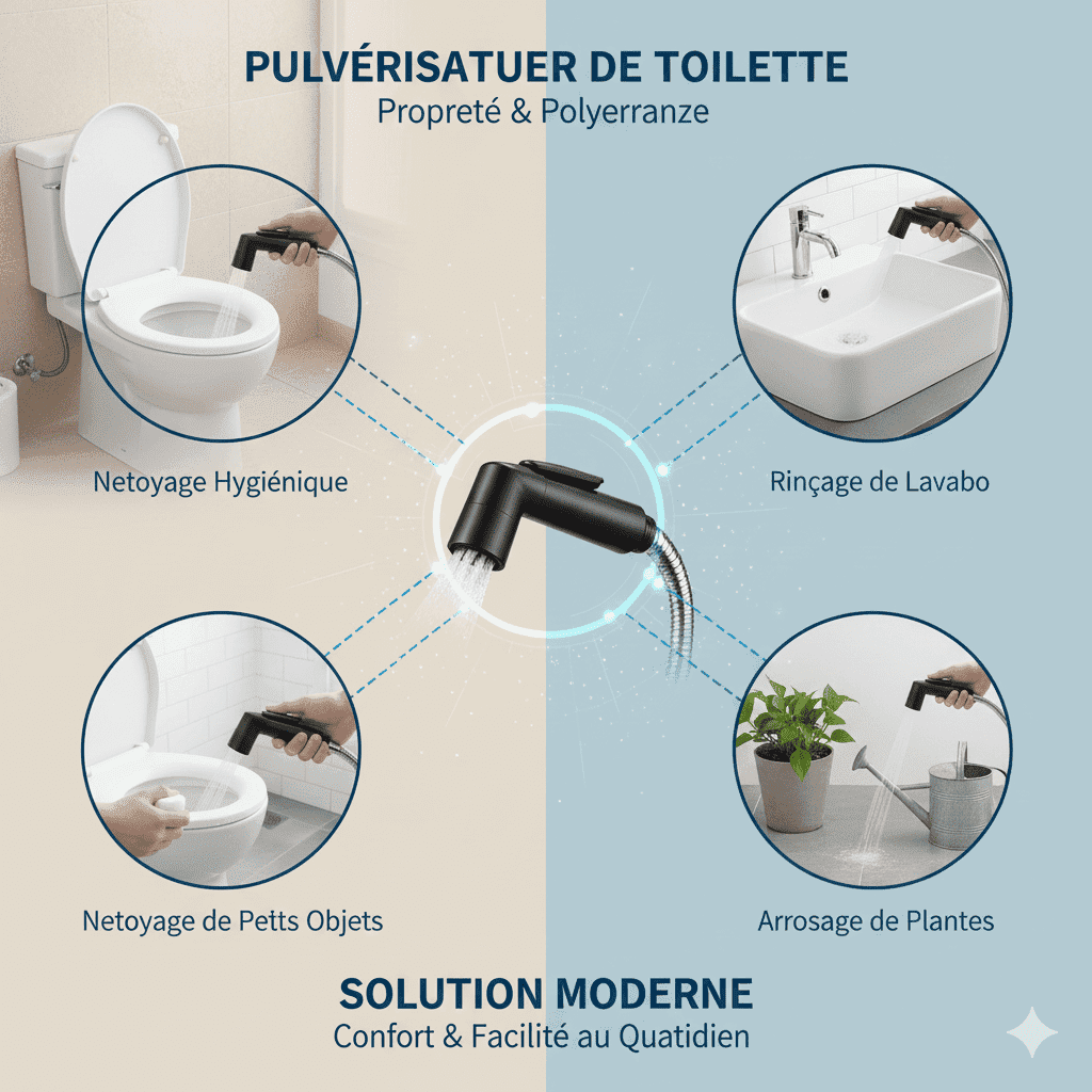 Le pulvérisateur de toilette multifonction est une solution moderne et hygiénique conçue pour simplifier le nettoyage quotidien. Grâce à sa pression réglable et son design ergonomique, il offre un contrôle précis de l’eau pour une utilisation confortable et efficace. Polyvalent, il s’adapte aussi bien au nettoyage des toilettes qu’au rinçage du lavabo, au lavage de petits objets ou même à l’arrosage des plantes. Un indispensable pour une salle de bain propre, pratique et économique.