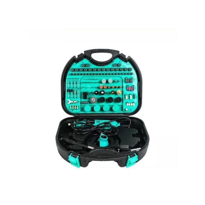 Accessoires inclus 252 pièces (disques, meules, forets, bandes de ponçage, brosses, mandrins, feutres, etc.)