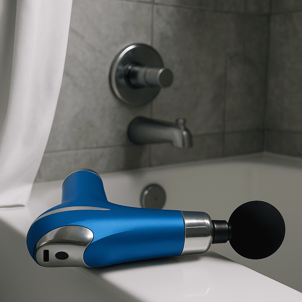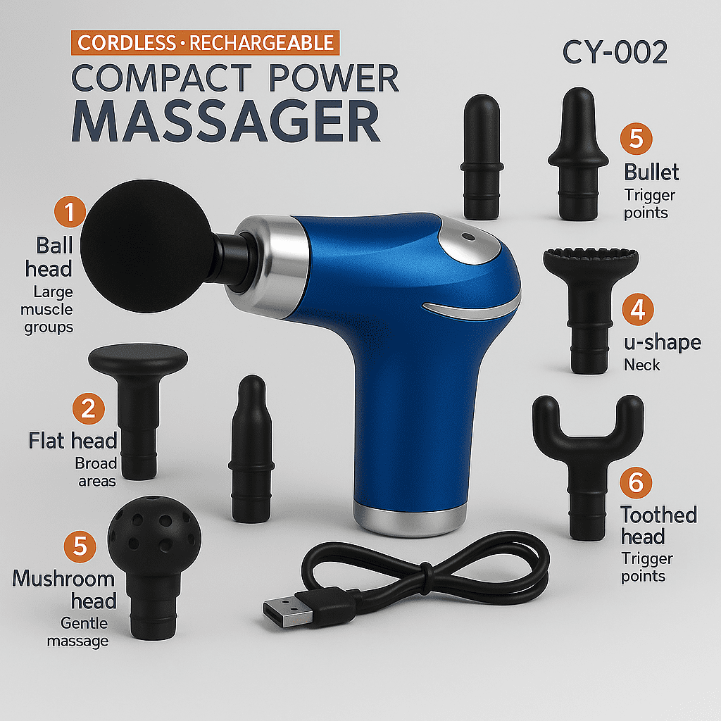 Pistolet de Massage Compact Dinex CY-002 – 6 Têtes Interchangeables, Sans Fil & Rechargeable, Couleur Bleu Métallique