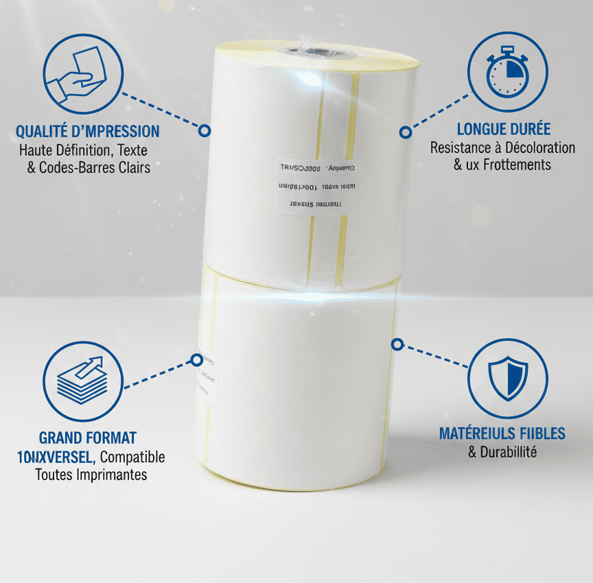 Les étiquettes thermiques sont la solution idéale pour une impression rapide, nette et sans encre. Conçues pour un usage professionnel intensif, elles garantissent une lisibilité parfaite des textes et codes-barres, tout en assurant une excellente adhérence sur différents supports.Grâce à leur compatibilité universelle avec les imprimantes thermiques (Xprinter, Zebra, Bixolon, etc.), ces rouleaux sont parfaitement adaptés à l’emballage, la gestion de stock, l’organisation produit et l’expédition logistique.Robustes et durables, les étiquettes offrent une résistance élevée aux frottements, à l’humidité et à la décoloration, assurant ainsi une conservation optimale des informations dans le temps. Un choix fiable pour les commerces, entrepôts, e-commerçants et professionnels de la logistique.