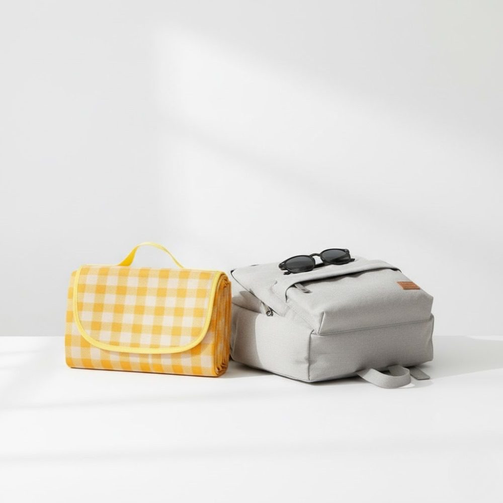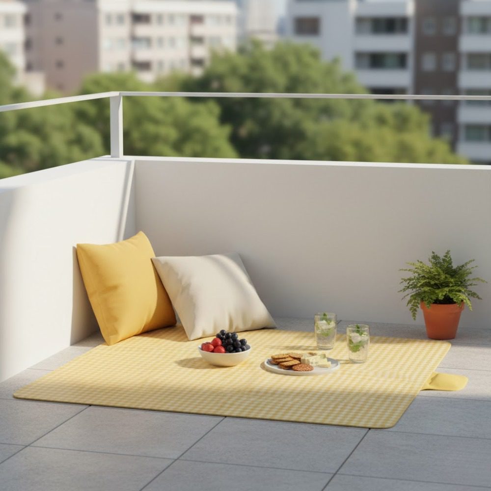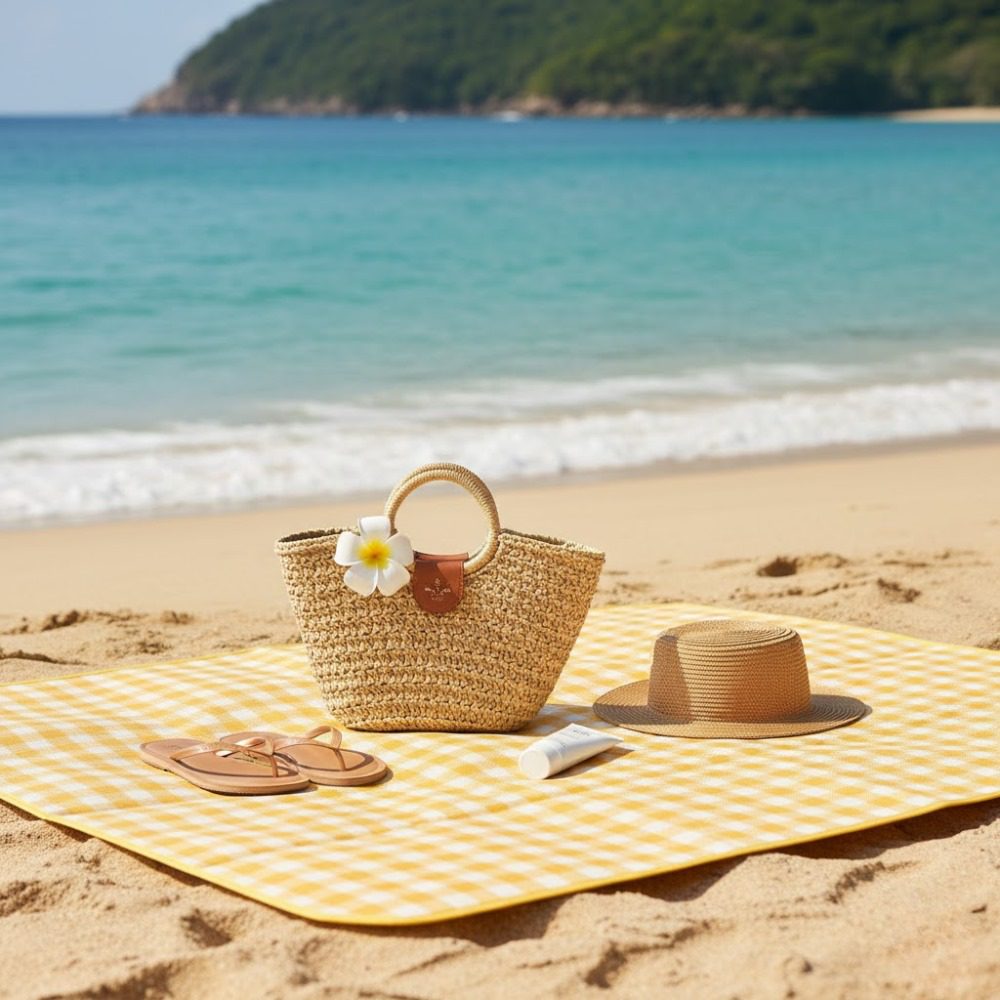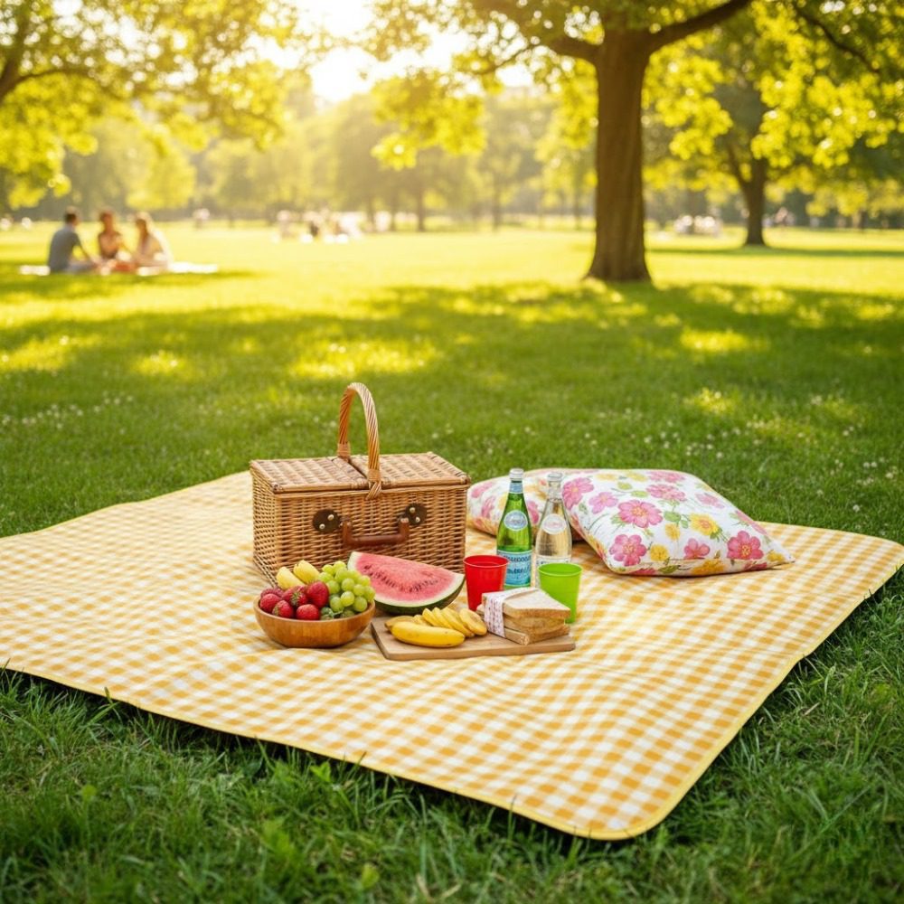 Apportez une touche de soleil à vos moments de détente avec ce tapis de pique-nique au motif vichy jaune, parfait pour vos sorties à la plage, au parc ou en camping.