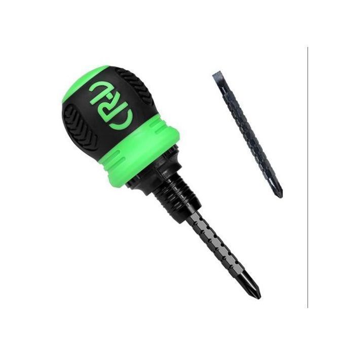 Le tournevis trapu de poche est doté d’un embout à double extrémité avec un fendu et un croisé.