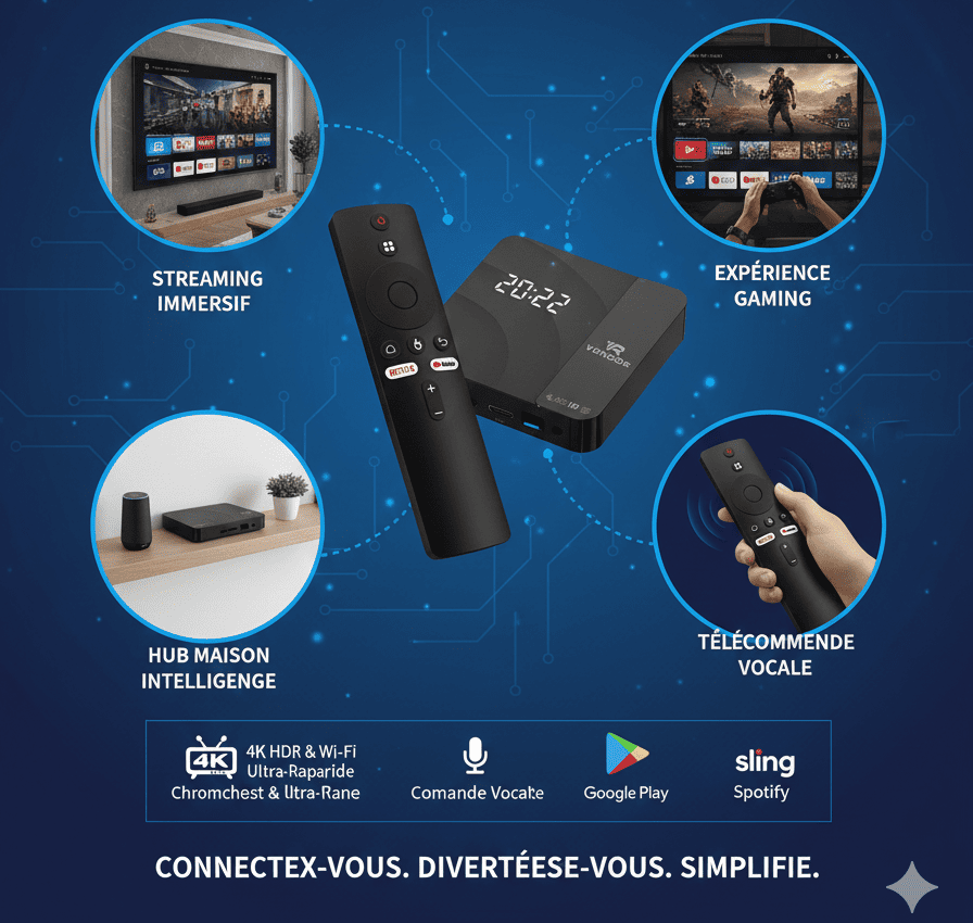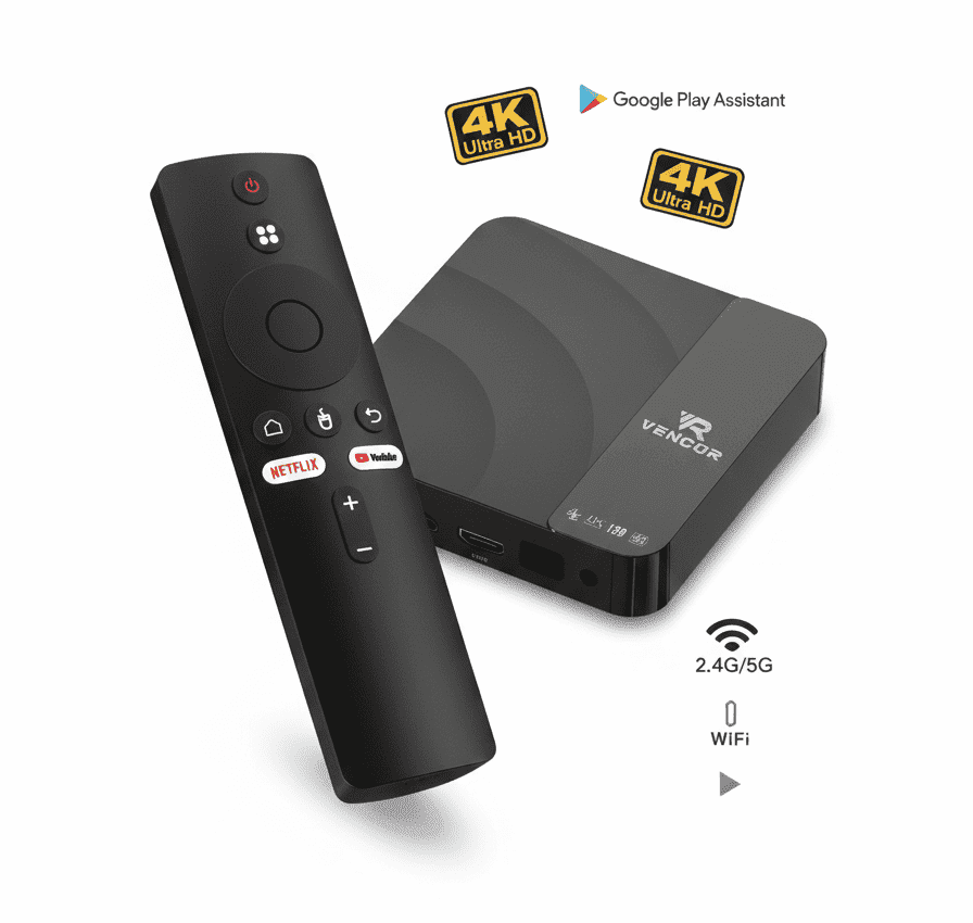 La VENCUR Box S transforme n’importe quel téléviseur en une véritable Smart TV 4K Ultra HD. Équipée d’Android TV avec Google Assistant et Chromecast intégrés, elle donne accès facilement à Netflix, YouTube, Spotify, IPTV, et d’autres applications de divertissement. Sa connectivité Wi-Fi performante garantit un streaming fluide et stable. Livrée avec une télécommande intelligente, cette box est idéale pour le divertissement à domicile et aussi de code activation 8888
